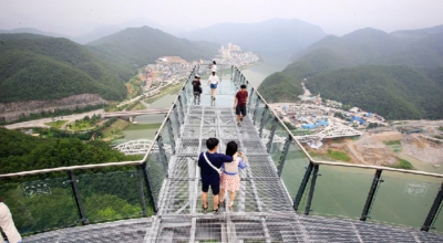스카이워크는 남한강 절벽의 산꼭대기에 위치하고 있으며, 80~90m 아래의 수면을 관망할 수 있는 산책로를 걸을 때 스릴을 만끽할 수 있으며, 걷는 데 시간이 꽤 소요되어요. 따라서 차량을 주차하고 스카이워크가 설치된 건물까지는 셔틀버스 이용을 추천하고, 입장료는 1인당 3,000원이예요.