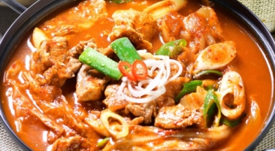 잘 익은 통배추김치 1kg,버터 2큰술,식용유 3큰술,돼지 목살 500g,채 썬 양파 200g,멸치 육수 5컵,체에 거른 김칫국물 1컵(취향껏 조절),어슷썰기한 대파 100g,어슷썰기한 청양고추 3개,어슷썰기한 홍고추 한 개