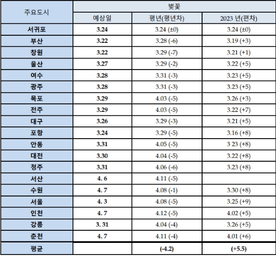 벚꽃 개화시기 2024 - 주요도시별 개화시기